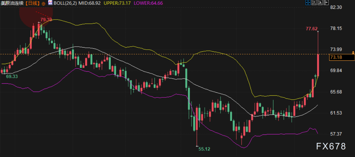 布伦特原油期货报收于每桶74.23美元,上涨7.02%,此前曾飙升逾13%至78.50美元的盘中高点,为1月27日以来的最强水平。