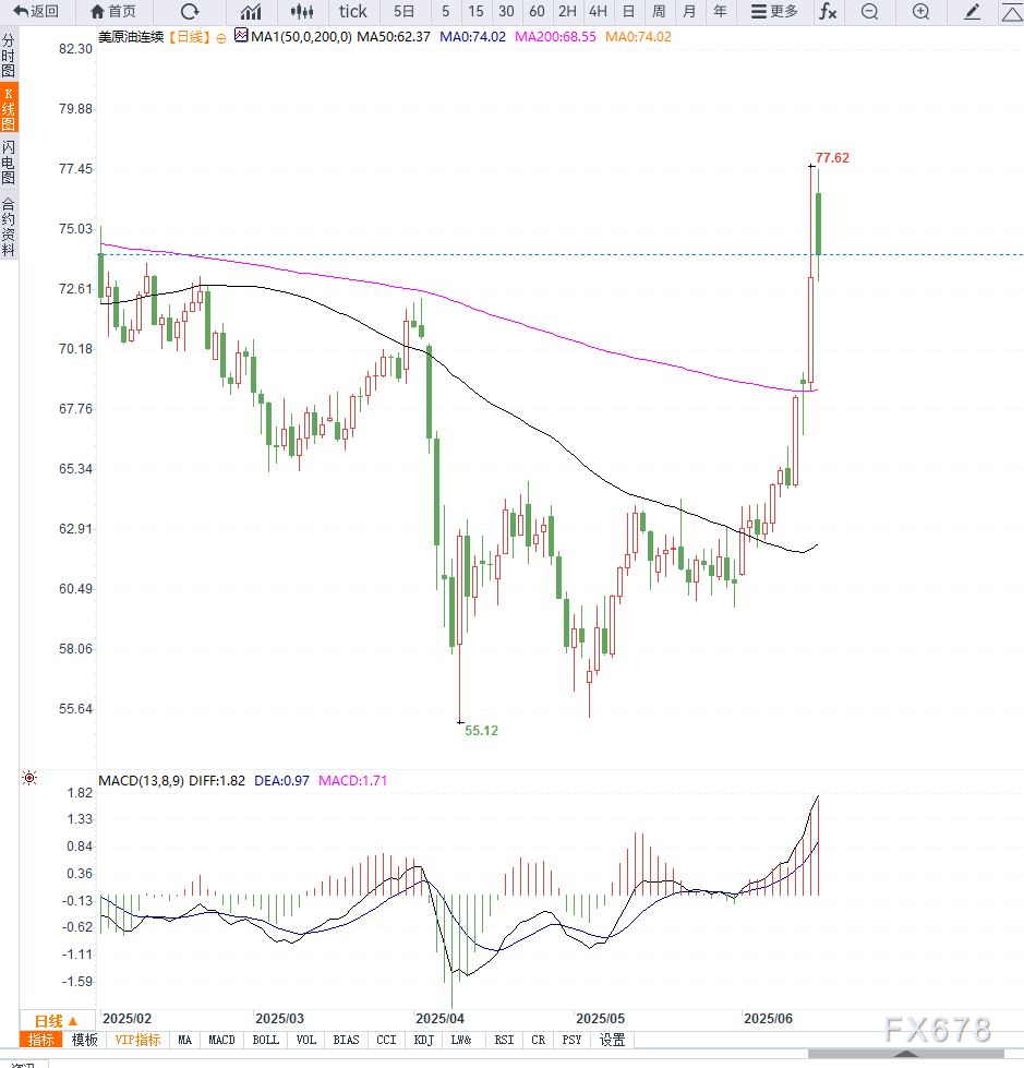 霍尔木兹海峡或成焦点,全球近20%原油运输受威胁   当前冲突的核心隐忧集中在霍尔木兹海峡——这一全球最重要的石油运输通道。数据显示,约占全球总消费量五分之一的石油及其相关产品每天有1800万至1900万桶通过该海峡。一旦该通道受阻,国际市场可能面临严重的供应短缺局面。   Fujitomi Securities分析师Toshitaka Tazawa表示:“油价上涨主要受以色列与伊朗冲突持续推动,目前看不到任何缓解迹象。”   不过他也指出,随着上周五盘中超涨,部分投资者已开始担忧市场是否出现过度反应,短期内或有回调压力。   伊朗产能受关注,OPEC可用闲置产能有限   目前,作为石油输出国组织(OPEC)成员国的伊朗,其原油日产量约为330万桶,其中每日出口量超过200万桶。如果以色列的打击波及伊朗能源设施,可能对其出口能力造成直接打击。   据市场调查显示,OPEC及其盟友(包括俄罗斯)目前的备用产能大致与伊朗的日产量相当,约在300万桶/日左右。然而,由于部分备用产能处于技术瓶颈或政治限制状态,是否能完全弥补伊朗潜在出口缺口仍存疑虑。   在国际社会方面,各方积极展开外交斡旋。美国总统特朗普在周日表示,希望以色列与伊朗能够达成停火协议,但他也补充称:“有时国家之间必须先打完这一仗。”特朗普强调美国将继续支持以色列,但未透露是否曾建议以色列暂停打击行动。   德国总理Friedrich Merz则在七国集团(G7)领导人峰会前表示:“希望本次加拿大峰会能就防止冲突升级达成一致意见。”   然而,据市场调查显示,伊朗方面已通过卡塔尔与阿曼等调解国明确表示,在遭受以色列攻击期间,不会同意任何停火谈判,这也令局势更趋复杂化。   从技术面来看,美国WTI原油日线图上,自5月下旬以来油价已形成明显的V型反转走势,目前运行在主要均线系统上方,短期上升趋势线支撑良好。   MACD指标形成金叉,动能柱持续放大,表明多头力量依旧占优。当前油价已逼近前期高点75美元关口,若能有效突破并站稳,则有望向78美元至80美元的前期阻力区间发起冲击。   但需注意,日线图上的相对强弱指标(RSI)已接近超买区,若地缘消息面未有进一步刺激,不排除高位出现技术性整理或短暂回调的可能。整体来看,短期内油价上行动力仍存,但震荡加剧的概率同步上升,市场情绪将持续受制于中东局势的最新动态。