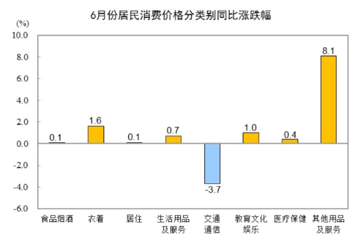 其他七大类价格同比六涨一降。其中,其他用品及服务、衣着、教育文化娱乐价格分别上涨8.1%、1.6%和1.0%,生活用品及服务、医疗保健、居住价格分别上涨0.7%、0.4%和0.1%;交通通信价格下降3.7%。