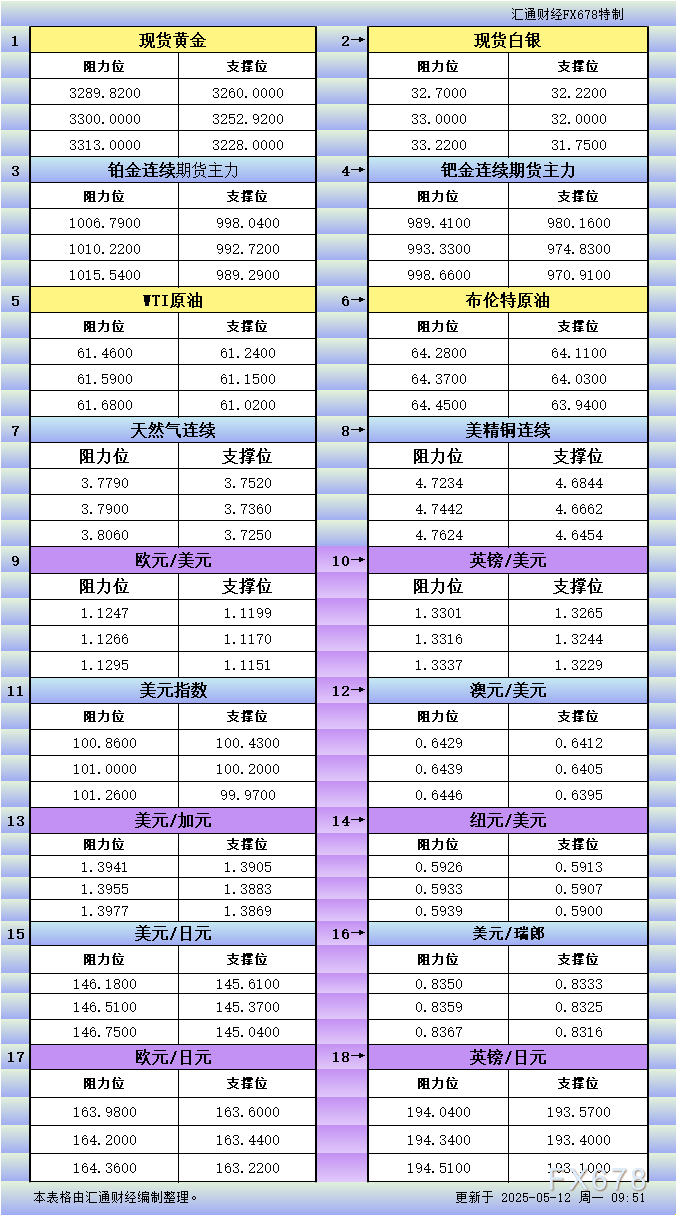 XM平台:一张图看商品支撑阻力:金银油气+铂钯铜农产品期货(2025年5月9日)